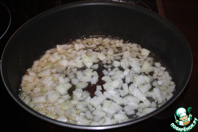 Кубиками нарезать лук и выложить туда же, тушить до прозрачности.