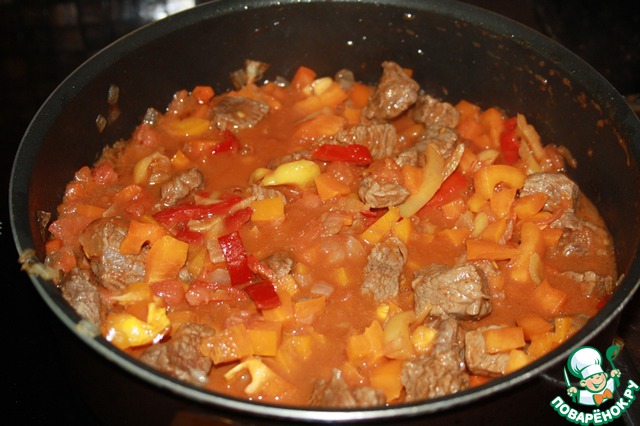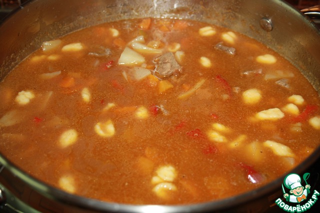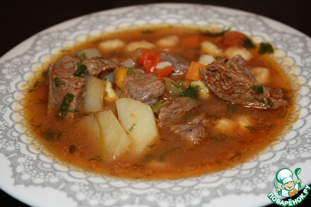 | "Бограч", венгерский суп. Рецепт этого вкуснейшего супа мне привез супруг из Западной Украины, теперь просит готовить дома)) Можно готовить из разного мяса (говядина, телятина, баранина), у меня телятина. Также его готовят в казане и на костре. Всем рекомендую!) |