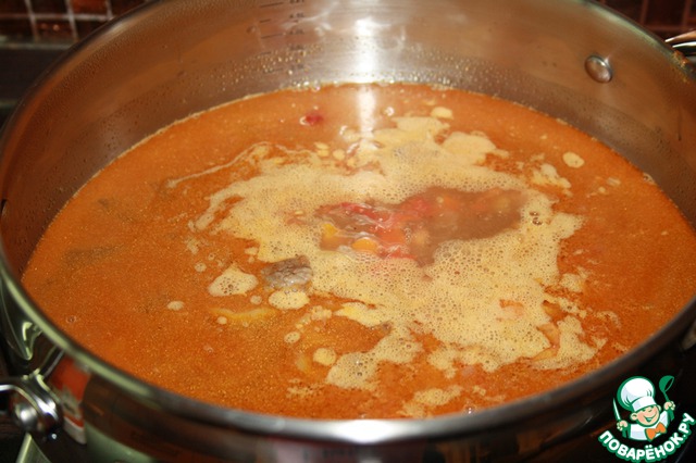 Приготовленное мясо с заправкой переложить в глубокую кастрюлю, залить 1,5 л кипятка.