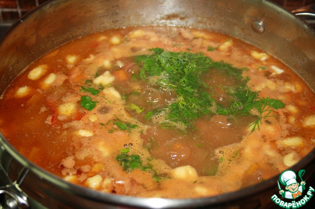 Высыпать в суп клецки и продолжать варить до их готовности (40 мин).