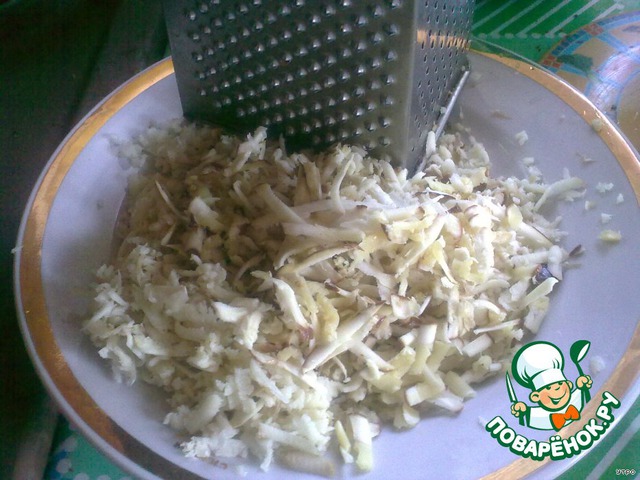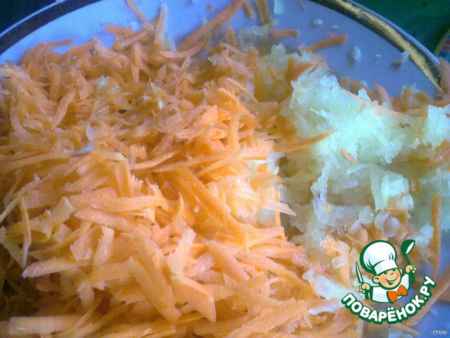 Так же трем морковь и лук. Слегка обжариваем на растительном масле грибы тертые, лук и морковь. Немного тушим.