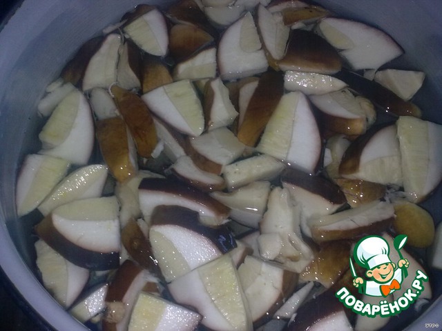 Из оставшихся грибов варим бульон (я варила около 45 минут). В середине варки добавляем нашу тушеную смесь лука, моркови и грибов. Солим.