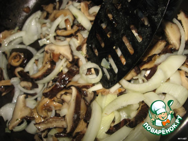 На раскаленной сковороде на среднем огне обжариваем лук с грибами. Солим, перчим.