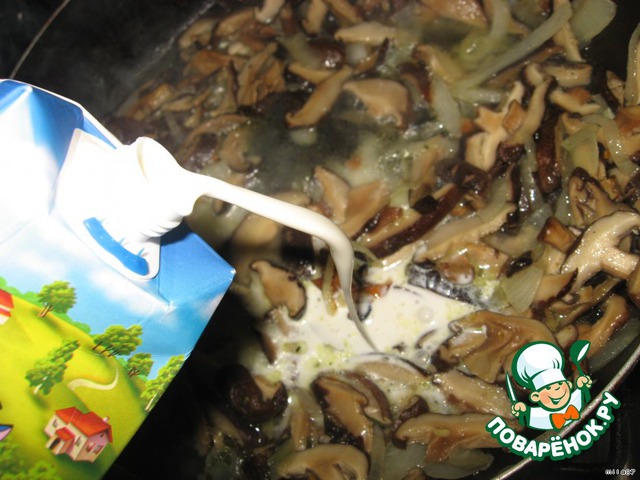 Когда лук и грибы будут почти готовы, вливаем сливки.