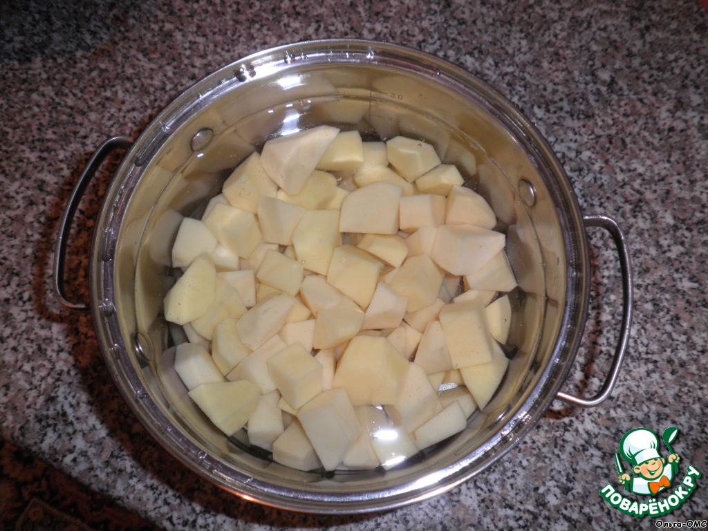 Нарезали картофель кубиками, залили хорошо водой, кладем вариться. Когда закипит вода, солим по вкусу.