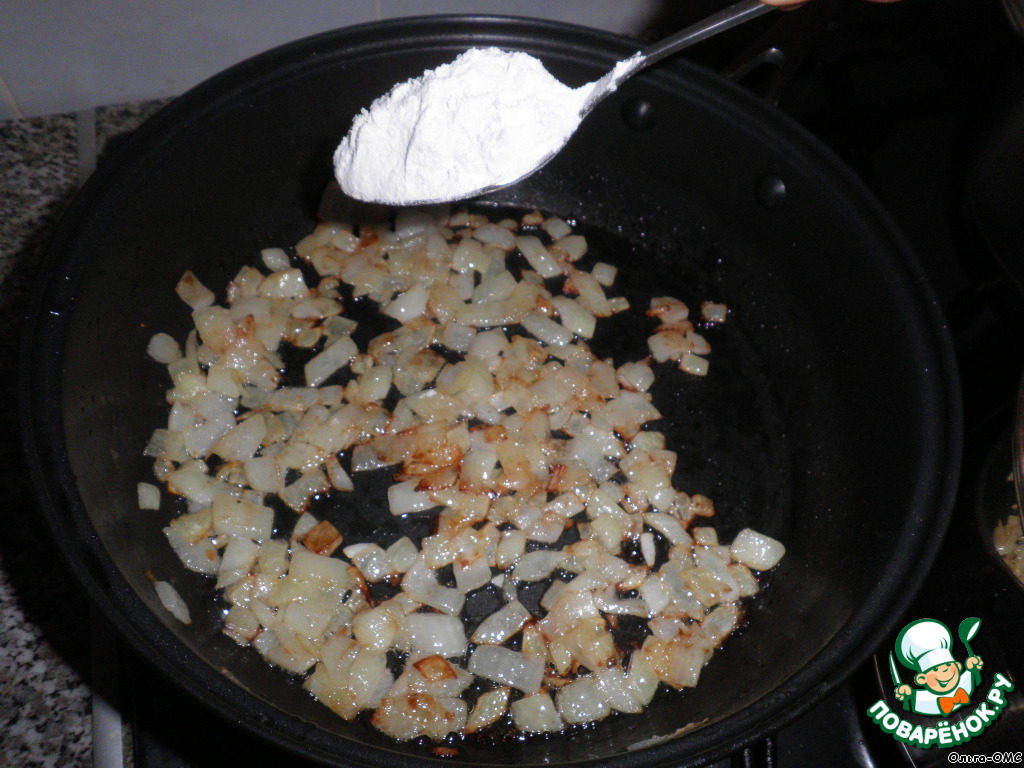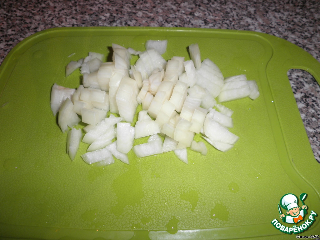 Пока варится картофель, делаем зажарку... нарезали кубиками лук и обжариваем на сковороде.