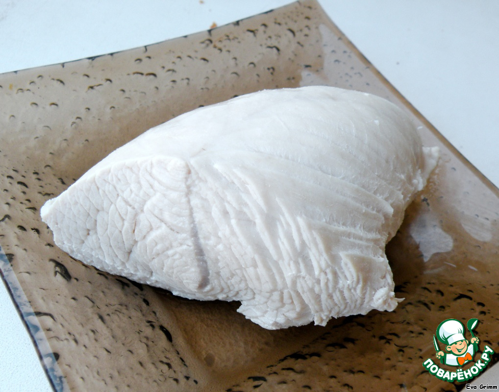 Филе отварить в нужном количестве воды примерно 15 минут, не забывать снимать пенку. Филе остудить...