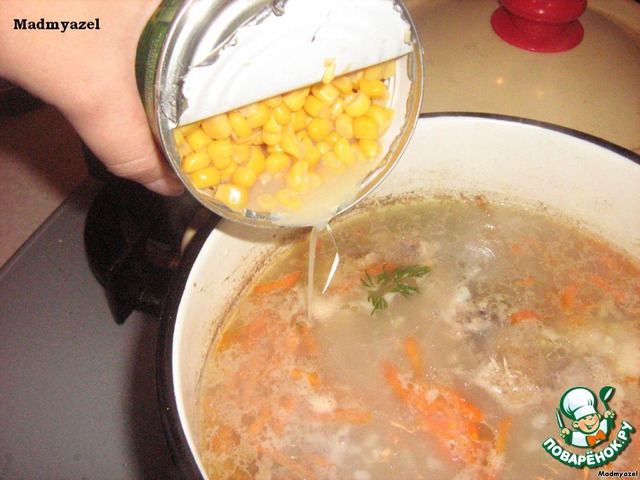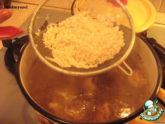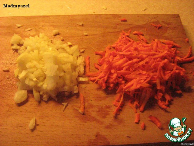 Вместе с рисом добавьте в суп натертую морковь и мелко нарезанный лук.