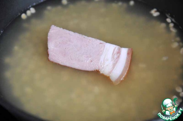 Через 30 минут после варки кладём грудинку целым куском и продолжаем варить.