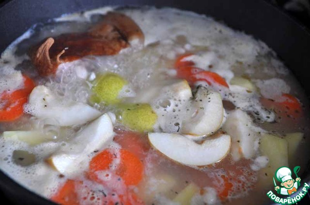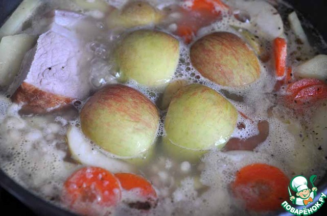 Через 15 минут добавляем нарезанное на 4 части яблоко (предварительно удалив сердцевину).
