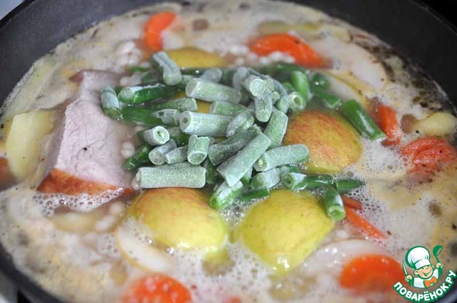 Заливаем по новой и ставим варить фасоль. Мне удобно использовать для варки айнтопфа сотейник.