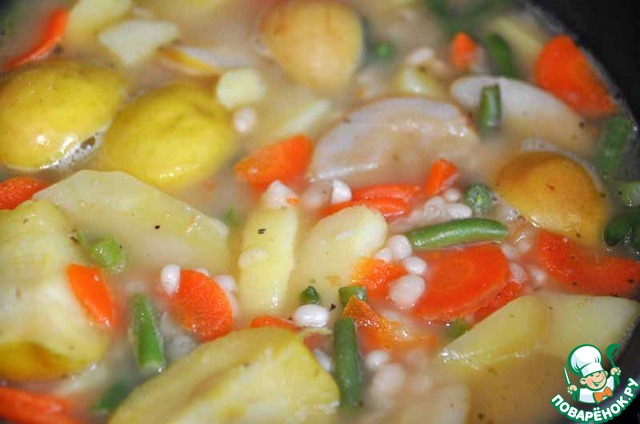 Приблизительно через час после начала варки добавляем в айнтопф морковь и картофель.
