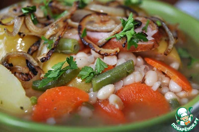 Подаём айнтопф, положив сверху нарезанную грудинку, посыпав зажаренным луком и мелко нарезанной петрушкой.