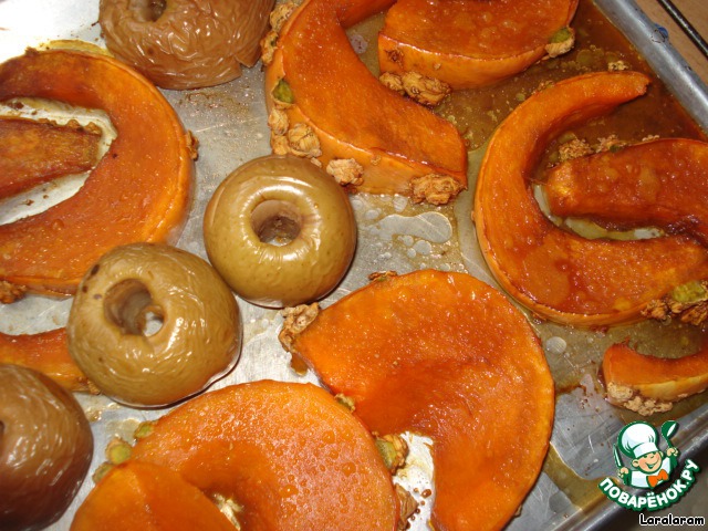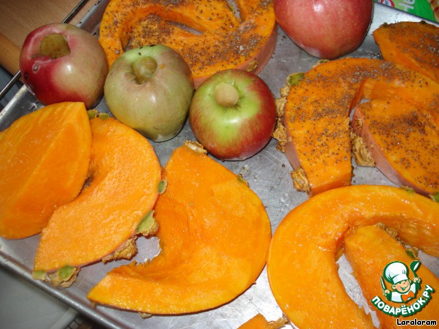 Противень тонко смазываем маслом, дольки тыквы смазываем маслом и посыпаем коричневым сахаром. С яблоками никаких манипуляций не проделываем! На противень кладём тыкву и яблоки и запекаем до готовности. Мякоть тыквы и яблок (ну, что с ней сделать? выскрести, выколупать? отделить от кожуры?) - одним словом, используется только мякоть яблок и тыквы. Пюрируем. У меня получилось много - я часть пюре использовала для другого блюда...