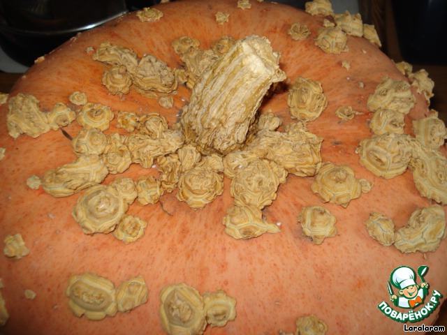 Тыкву режем дольками (семена выбрать, а кожуру можно оставить) - гляньте, какая у меня тыква выросла: не только красивая, сочная, яркая и вкусная, а ещё и забавная, вся в каких-то загогулинах. Это французский сорт - ох, это французы, не только лягушек лопают, но ещё и тыква у них с прибомбасами!