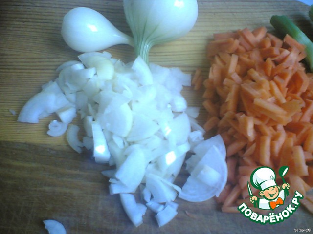 Лук и морковку нарезать некрупно. Картофель нарезать некрупными кубиками.