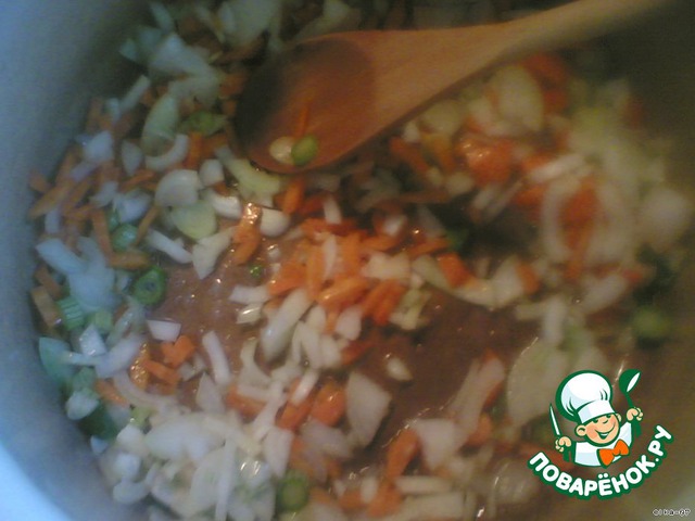 В кастрюльку положить сливочное масло и дать ему закипеть, положить лук и морковь, пожарить до прозрачности на маленьком огне. Следить, чтобы лук не начал коричневеть, он должен быть, как бы, прозрачным, но не зажаренным.