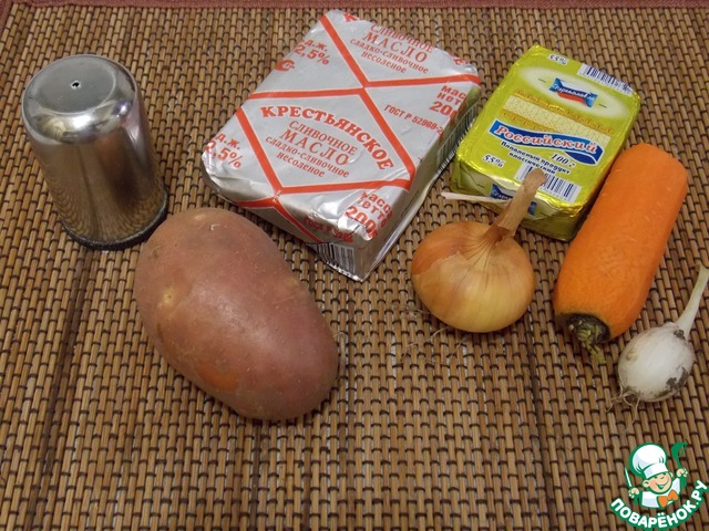 Овощи помыть и почистить. Морковь натереть на мелкой терке. Четыре картошки порезать брусочками. Ветчину порезать тонкими полосками и обжарить на сухой сковороде. Сырки порезать кубиком. Все сложить в мультиварку, влить 1 л. воды. Две картошки кладем целиком. Добавляем сливочное масло.