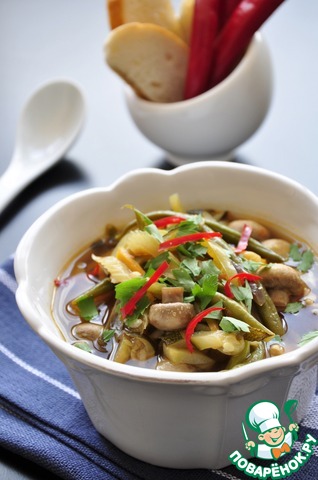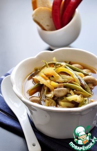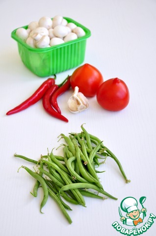 Фасоль очистить от хвостиков, добавить к овощам. Если слишком длинная, нарезать.