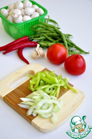 Нарезать болгарский перец и черешковый сельдерей, добавить к овощам. Готовить 1-2 минуты.