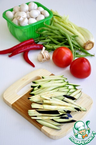 Нарезать цуккини и баклажан соломкой, добавить в сковороду.