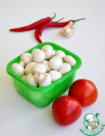 Добавить шампиньоны (если крупные, порезать), натертые помидоры на терке, кожицу выбросить и готовить минут 7. Овощи должны остаться хрустящими.