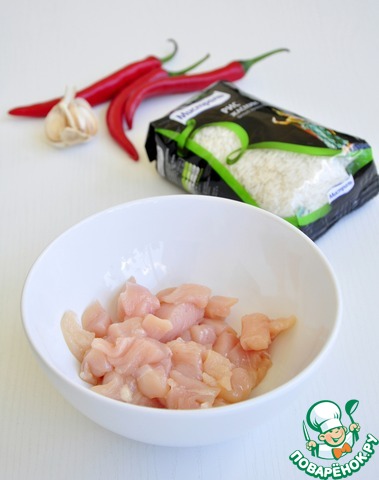 Пока овощи будут готовиться, помыть куриное филе, нарезать небольшими кусочками. Отварить минут 5 в кастрюле на 2 литра воды, промыть и добавить рис. Когда рис будет готов, добавить овощи.