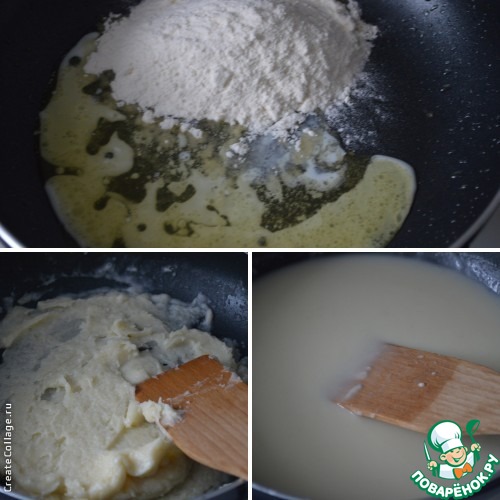 На ту же самую сковороду влить 2 ст. л. растопленного сливочного масла и добавить 2 ст. л. муки (без верха), хорошо размешать до однородного состояния. Через несколько минут понемногу добавлять бульон (комнатной температуры), хорошо размешивая.