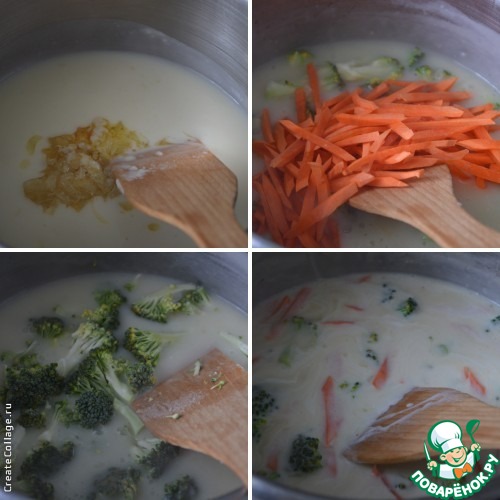 Перелить в кастрюлю, добавить обжаренный лук, соль и перец, перемешать. На небольшом огне довести до кипения, добавить брокколи (разделить на небольшие соцветия) и морковь. Хорошо перемешать и добавить сливки.