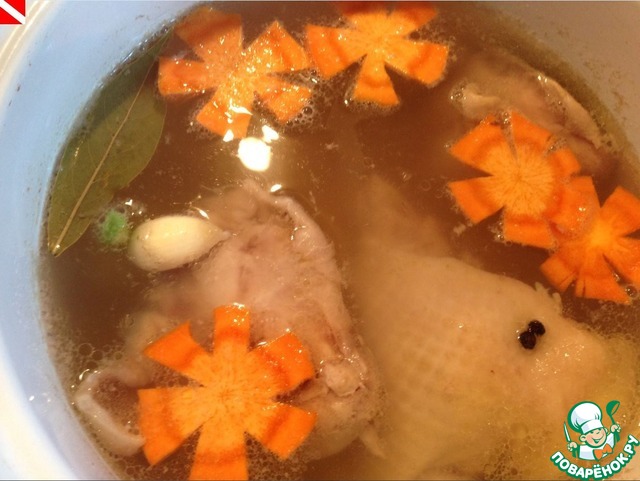 Приливаем процеженный куриный бульон. Перемешиваем.