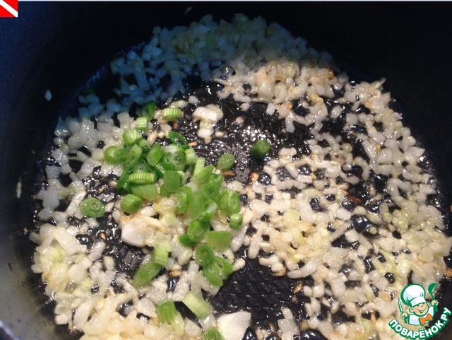 Стебельки зеленого лука нарезаем кружочками, добавляем в кастрюлю и жарим еще минутку.