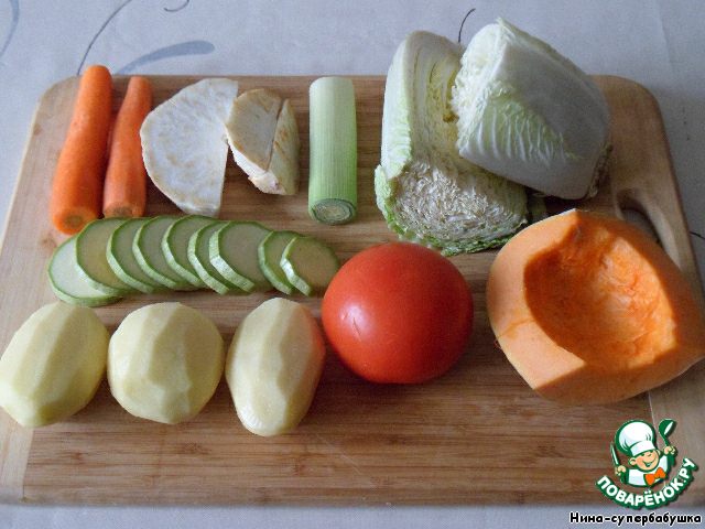 Жюльен - это способ нарезки овощей соломкой, поэтому морковь, сельдерей, тыкву и болгарский перец почистить и нарезать соломкой. Порей нарезать полуколечками.