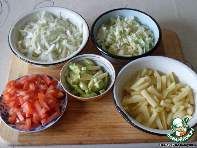 Капусту нарезать лапшой и отделить часть более толстых стеблей от нежной листовой части. Кабачок и картофель нарезать нетолстыми брусочками. Помидор - кубиками.