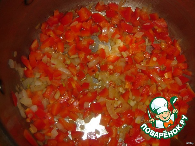 Перец и лук нарезать мелкими кубиками, измельчить чеснок и слегка обжарить овощи на растительном масле в объемной суповой кастрюле.