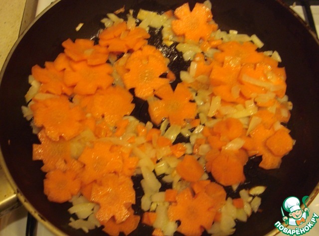 Режем мелко лук и морковку (можно фигурно, для пущей красоты), пассеруем на растительном масле, добавляем любимые специи.