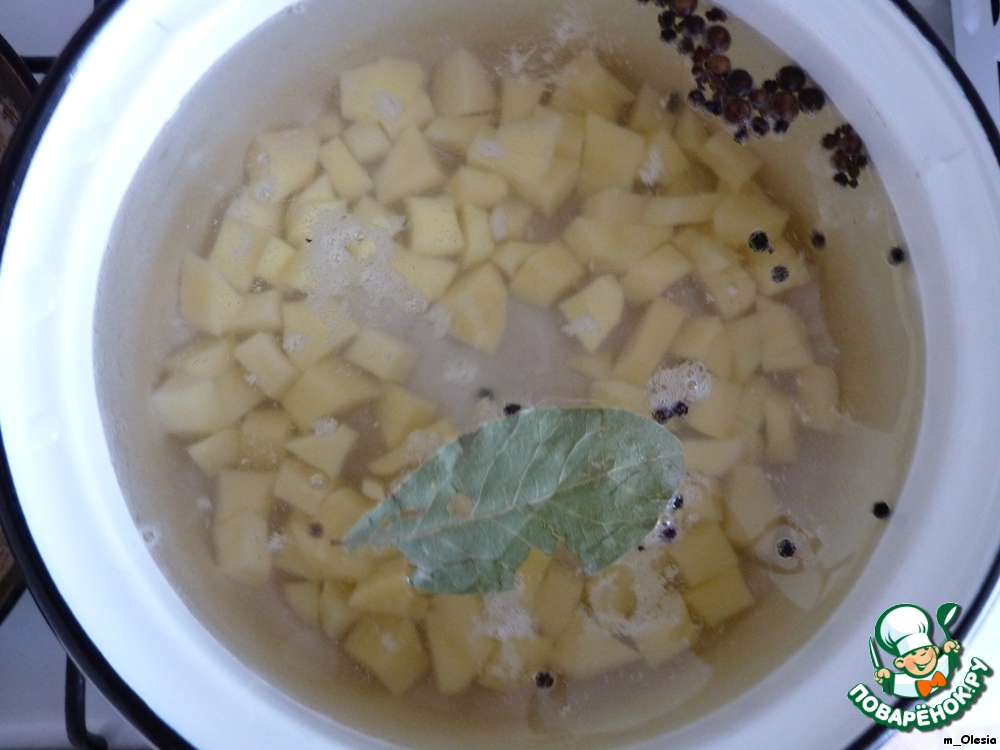 Кладем в кастрюлю с водой картофель и специи (лавровый лист, черный перец горошком, душистый перец) и ставим ее на плиту (у меня была кастрюля 2,5 л).