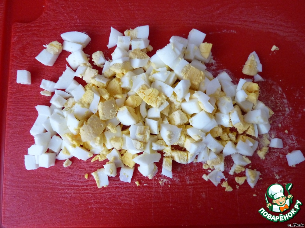 После того, как картофель и морковь будут готовы, отправляем нарезанные яйца в кастрюлю.