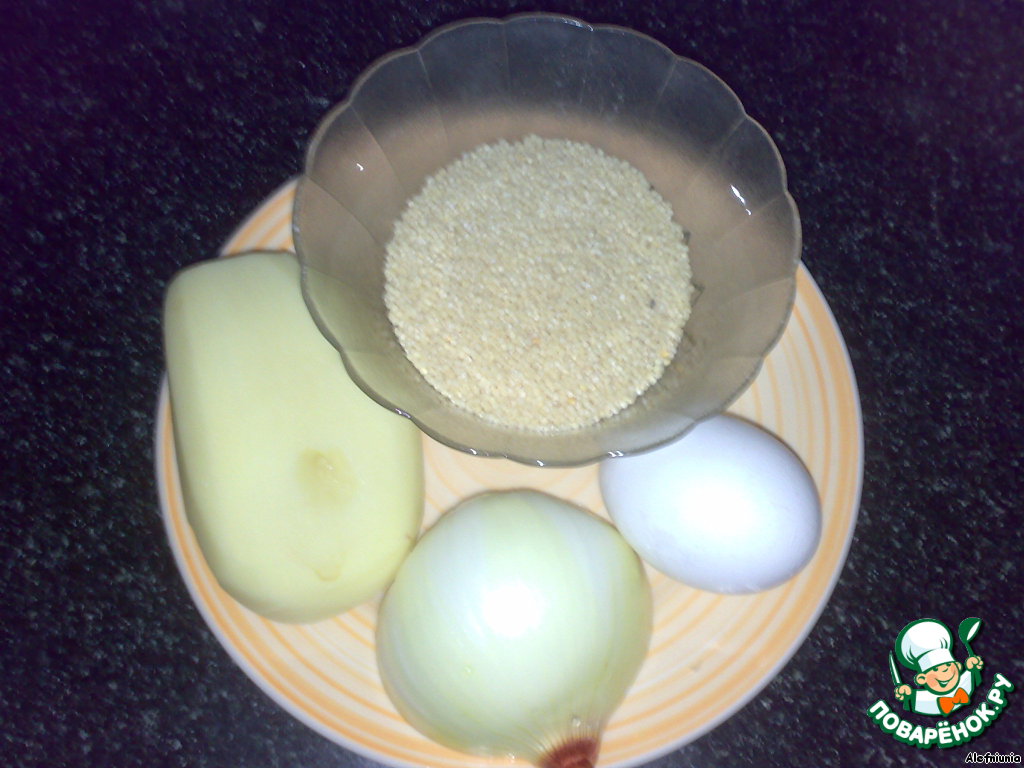 В кипящий бульон всыпать промытое пшено и картофель целиком. Варить до готовности.