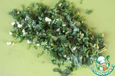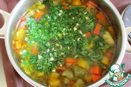 Снимаем суп с огня, засыпаем зелень и чеснок, накрываем крышкой и настаиваем минут 20.
