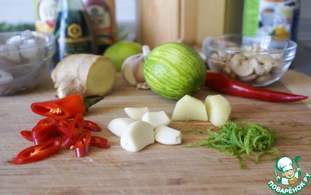 При подаче добавить цедру лайма и посыпать листочками кинзы и/или мяты. Ну и как известно - в Таиланде все красиво, поэтому и подать такой суп можно не только в глубокой тарелке, но и в кокосовом орехе.