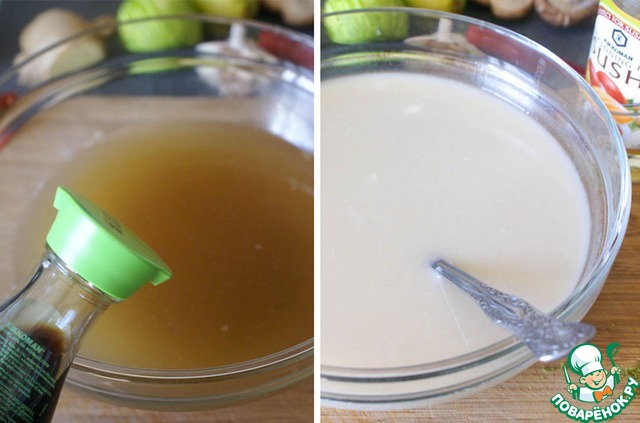 Креветочный бульон процедить, добавить 2 ст. ложки соевого соуса, 1 ч. ложку рисового уксуса и кокосовое молоко, перемешать.