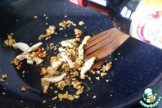 Добавить грибы, влить 1 ст. ложку соуса для вока и быстро обжарить.