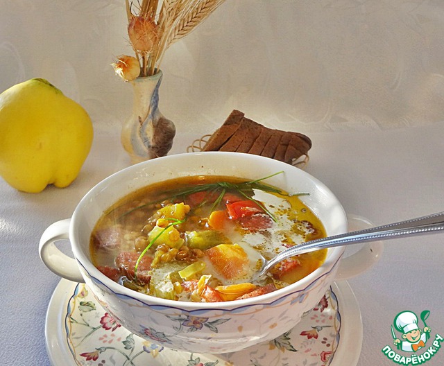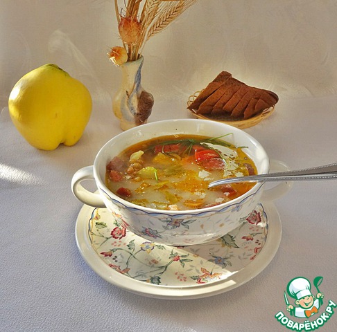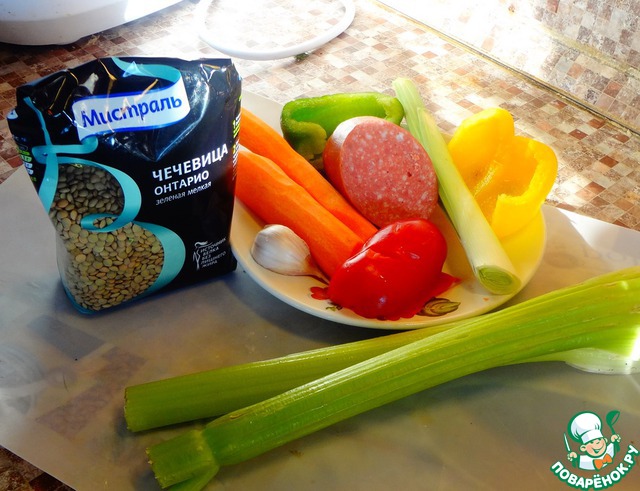 Вскипятить воду 2 л. залить овощи с колбасой, добавить чечевицу и варить 30 минут. посолить по вкусу. Специи тоже положите сами. можно положить 1ч. л. молотой паприки и тмина.