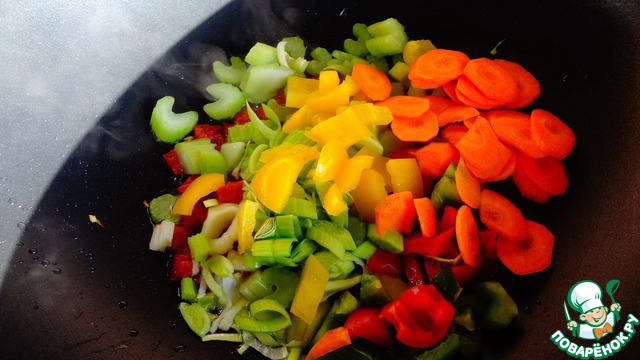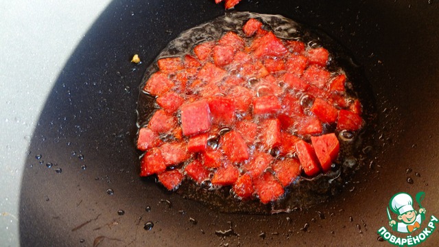 Овощи помыть и порезать не очень мелко. Добавить к колбасе и обжаривать мин 5.