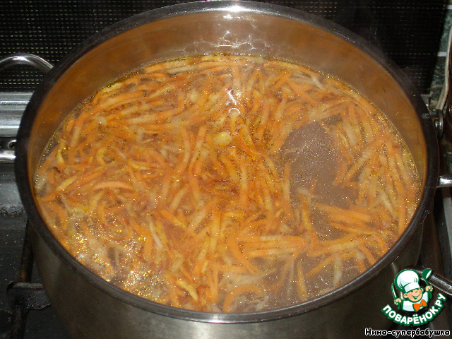 В кипящий бульон опустить картофель, довести до кипения, добавить зажарку.