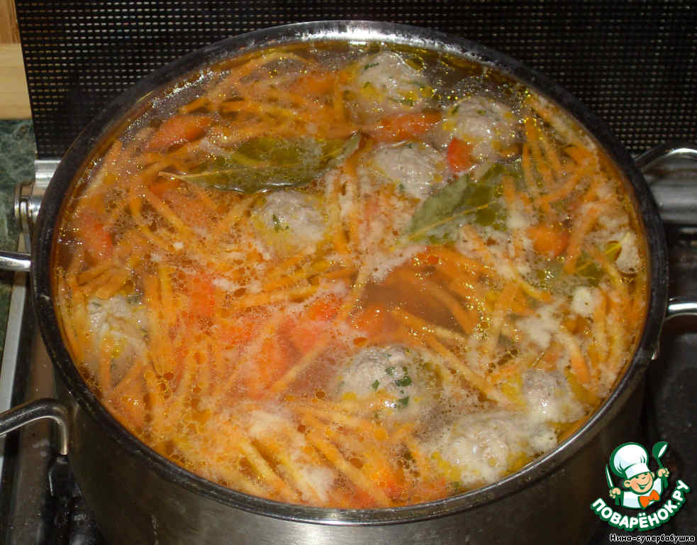 Опустить в суп фрикадельки, добавить лавровый лист и варить еще 2-3 минуты.
