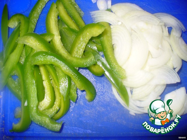Пока варится картофель, перец, и сало нарезать тонкими полосками, лук тонкими полукольцами.