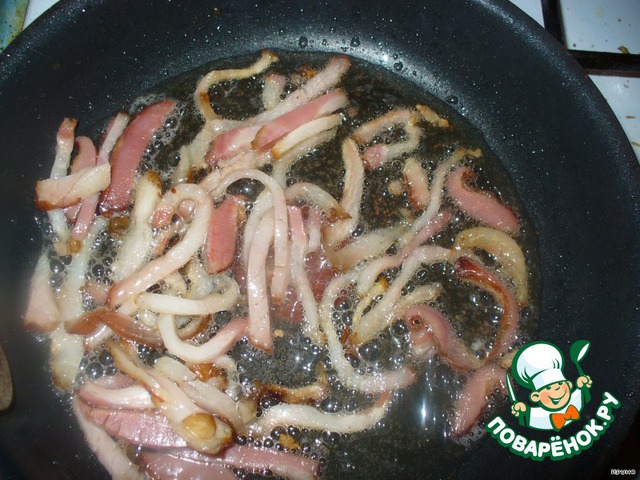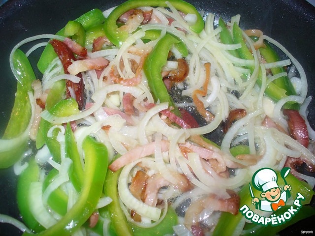 Затем, 2-3 минуты пассеровать в вытопившемся жире перец и лук.