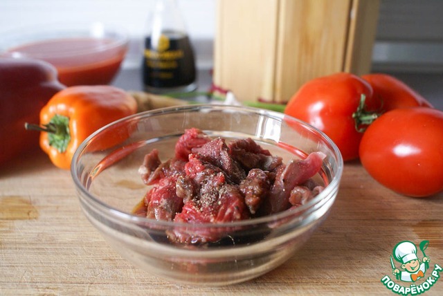 Подготовить продукты. Перцы и зелень вымыть и обсушить. Говядину при необходимости зачистить от пленок. Помидоры бланшировать и освободить от шкурок.