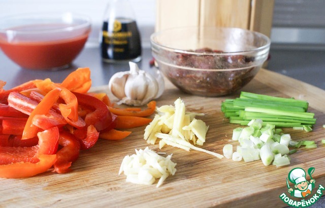 Перцы нарезать полосками. Имбирь тонкой соломкой. Чеснок измельчить. Зеленый лук нарезать колечками.